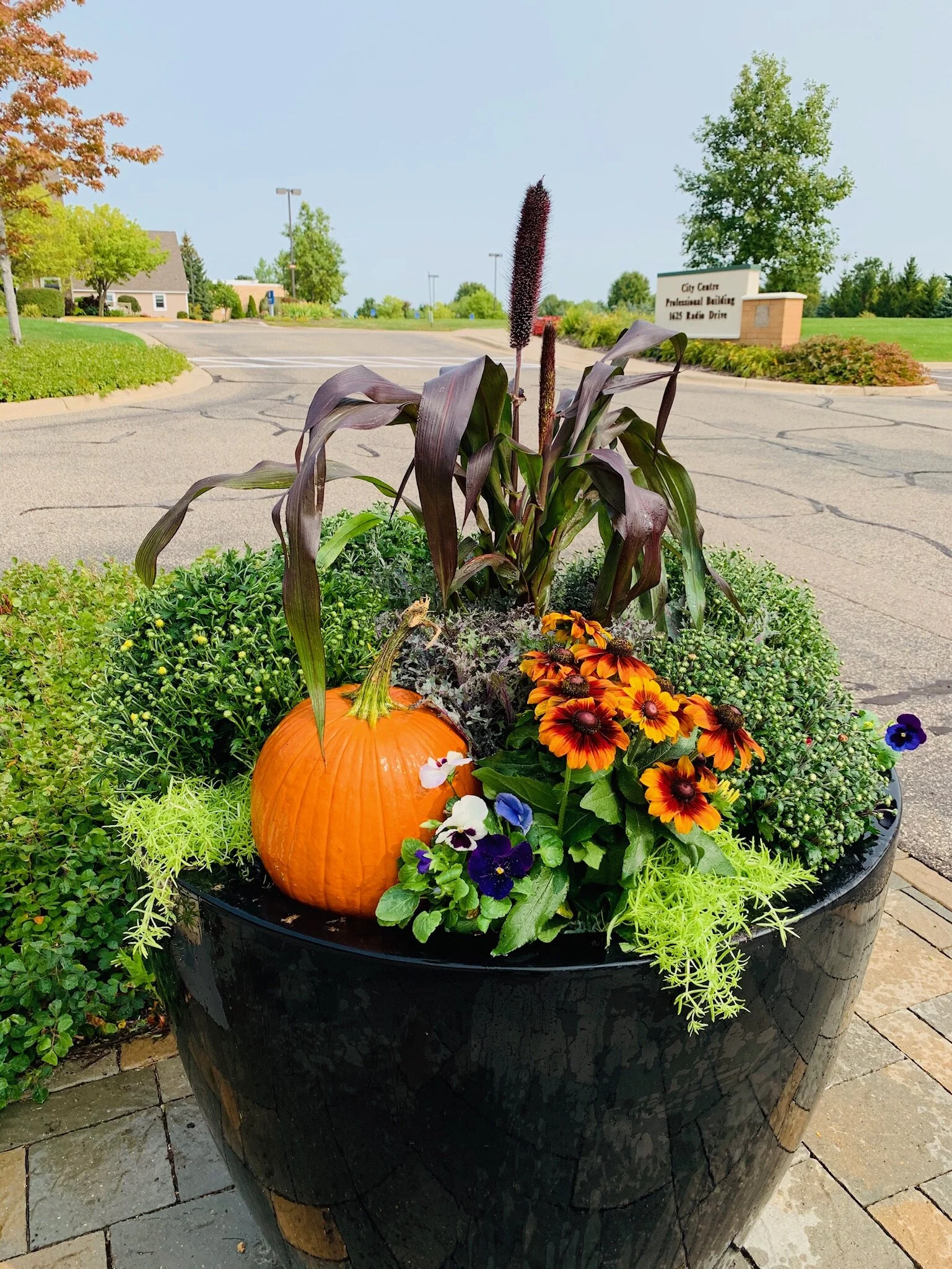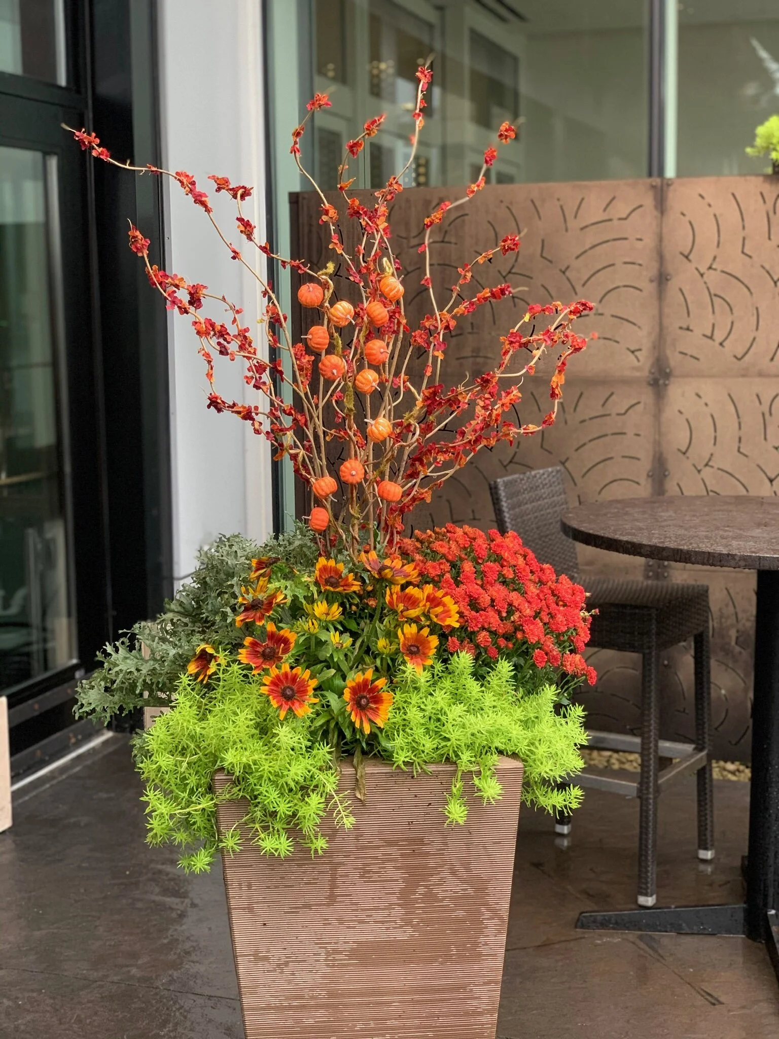 Autumnal mums, daisies, and ornamental kale provide the perfect balance against a commercial landscape to balance the grey skies and changing seasons.