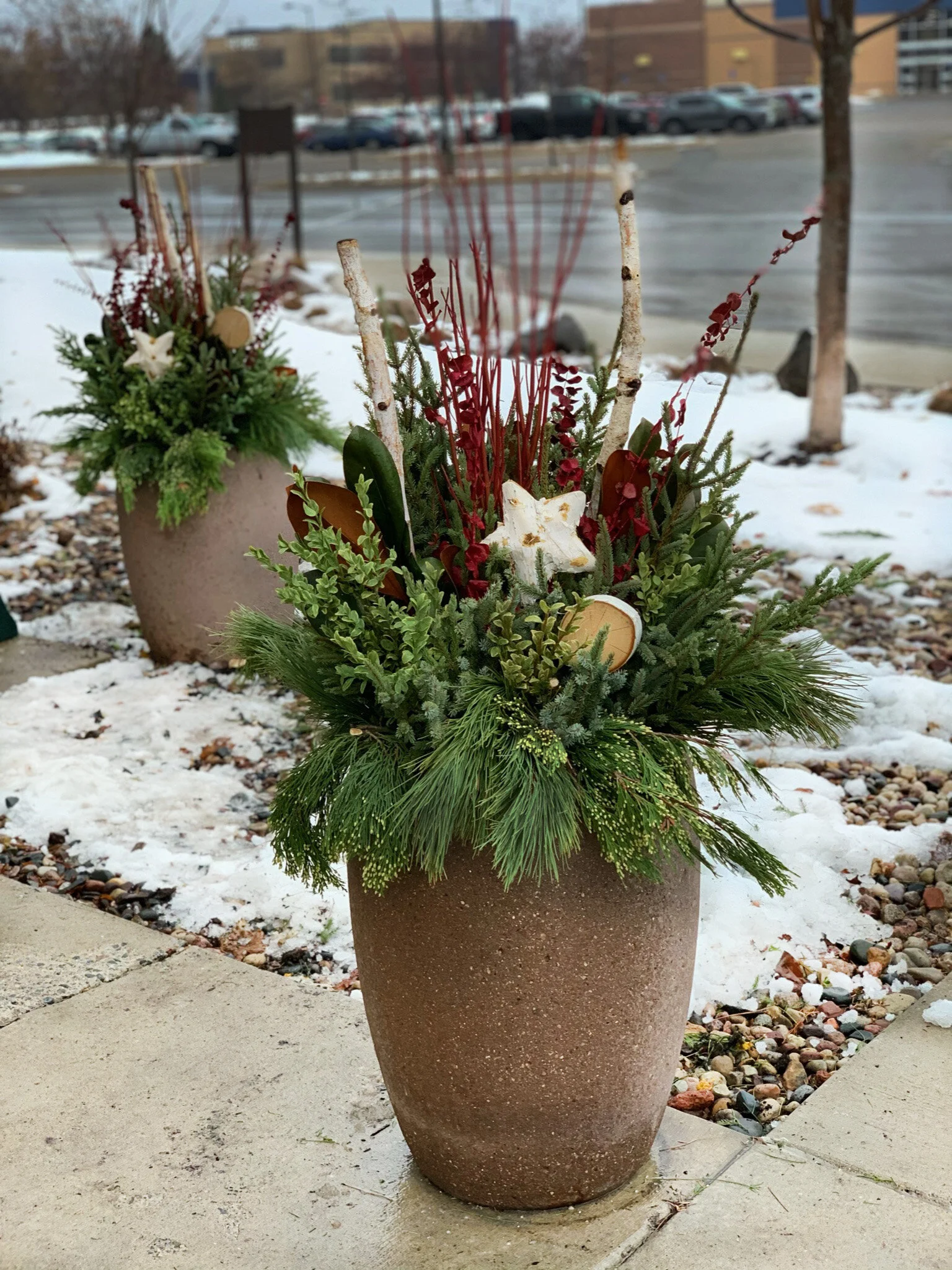 Festively decorated planters give commercial properties a warm and cozy atmosphere, well after the holidays have come and gone.